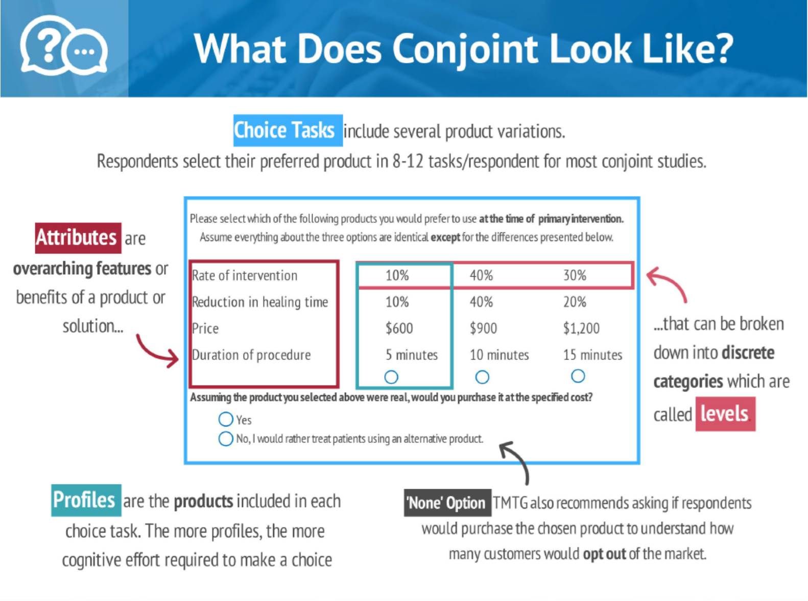 While conjoint seems like an accessible tool offered in most survey platforms that can be used to help your team design / test new products, reliably analyze willingness to pay, optimize a portfolio of products, make pricing decisions, or even test brand premium, the science and art involved for robust data and trustworthy is essential and not trivial. Conclusions drawn from conjoint analysis will only be as good as the initial model design. The choice of attributes and levels needs to take into account current and future competitive offerings and choice tasks must feel realistic and engaging, which requires careful consideration of the number of tasks, number of profiles, attribute and level design, and timing. The MarkeTech Group has over 20 years of experience guiding top-tier health care companies through the conjoint design process and providing their teams with high-quality, actionable results.