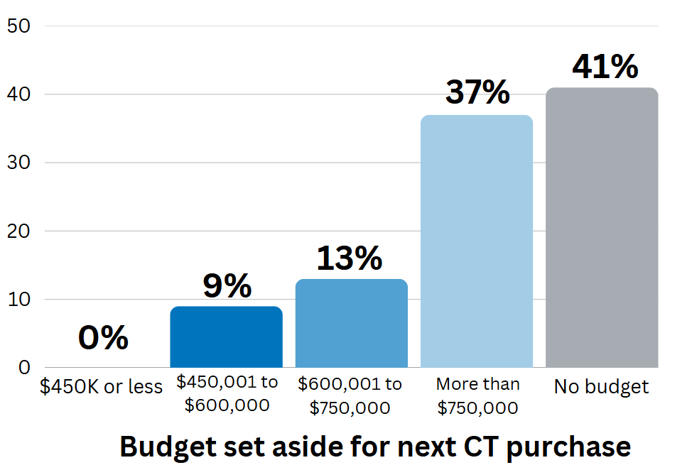 While 41% have yet to define their budget, 37% have set a budget of $750k or higher for their next CT purchase – which is likely to be a high-end system. 13% have a budget between $600k and $750k, and 9% between $450k and $600k – for the purchase of a mid-range CT scanner.