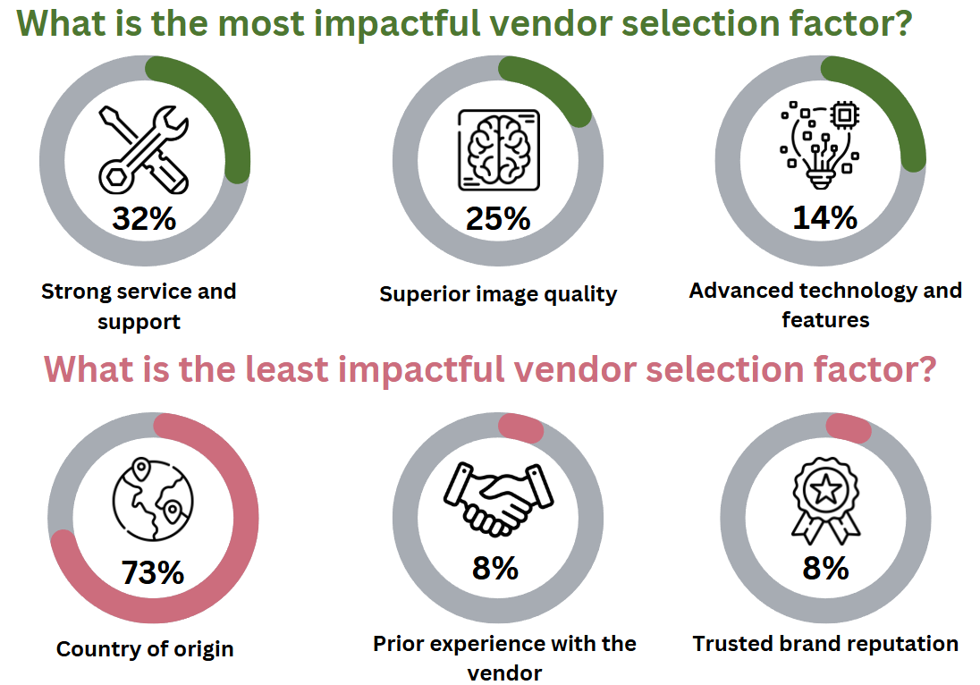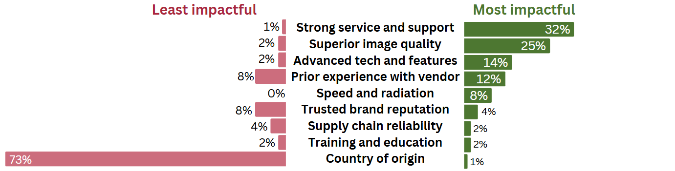 Aside from price, strong service and support (32%), and superior image quality (25%) are the most impactful factors when selecting a CT vendor. Service and support is crucial for high-utilization CT systems over an extended lifespan. Advanced technologies and features (29%) come third among most impactful factors. Prior experience with a vendor is most impactful for 12% of imagePRO members but also least impactful for 8%. This duality shows that while some customers select their current CT vendor for their next purchase, others are open to considering new vendors, especially since trusted brand reputation is least impactful for another 8%. The country of origin is considered the least impactful factor for CT vendor selection by 73%.