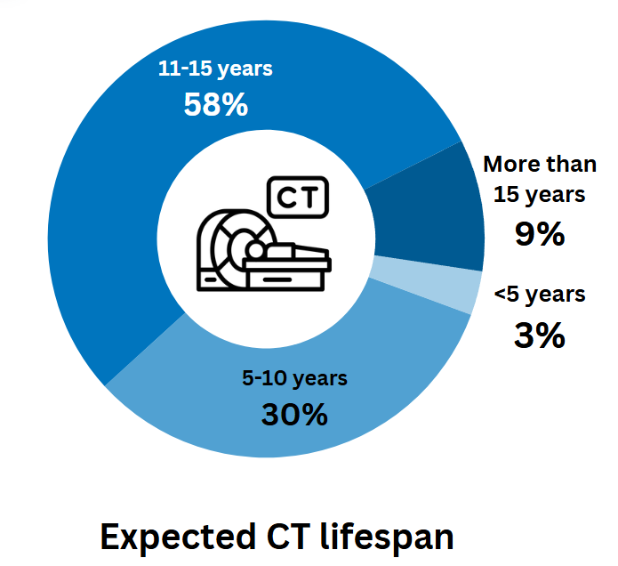In 2025, the majority of the imagePRO panel (58%) expects their next CT scanner to last between 11 and 15 years. Since average utilization rates have steadily increased because of higher patient volumes, it is likely that the trend is shifting toward extending the lifespan of CT scanners for “medium” and “high” utilization rates. 33% expect their CT system to last 10 years or less. For the 9% foreseeing a CT lifespan of 16 years or more, service, maintenance, and upgrade offerings will be crucial to handle usage over such extended periods.