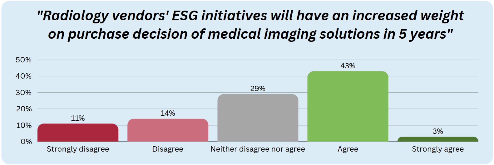 Despite the currently low importance of vendors' ESG initiatives in purchasing decisions, their influence is likely to increase within the next 5 years. A significant 46% of imagePRO members agree or strongly agree that radiology vendors’ ESG initiatives will carry significant weight in purchase decisions for medical imaging solutions within this timeframe. While 29% neither disagree nor agree with this statement, 14% disagree and 11% strongly disagree.