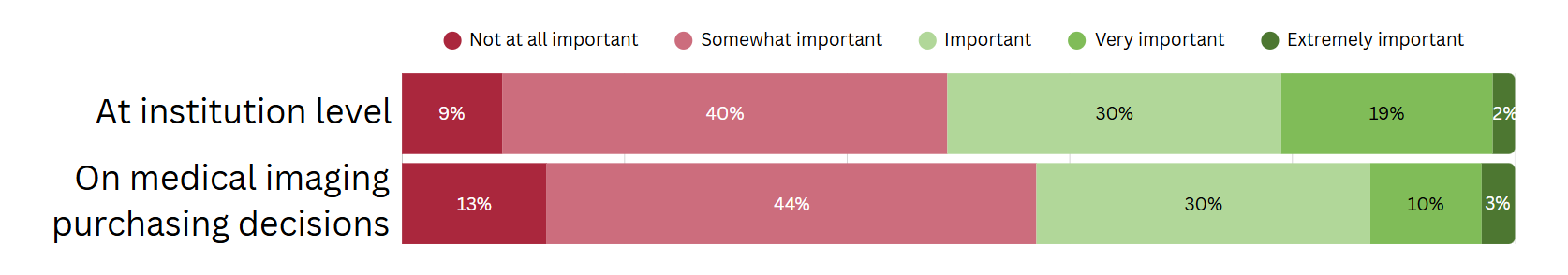 ESG initiatives appear to be valued more at the institutional level than in specific purchasing decisions. While 21% of imagePRO panel members find ESG initiatives very or extremely important for their institutions overall, this figure drops to only 13% when considering medical imaging purchases.