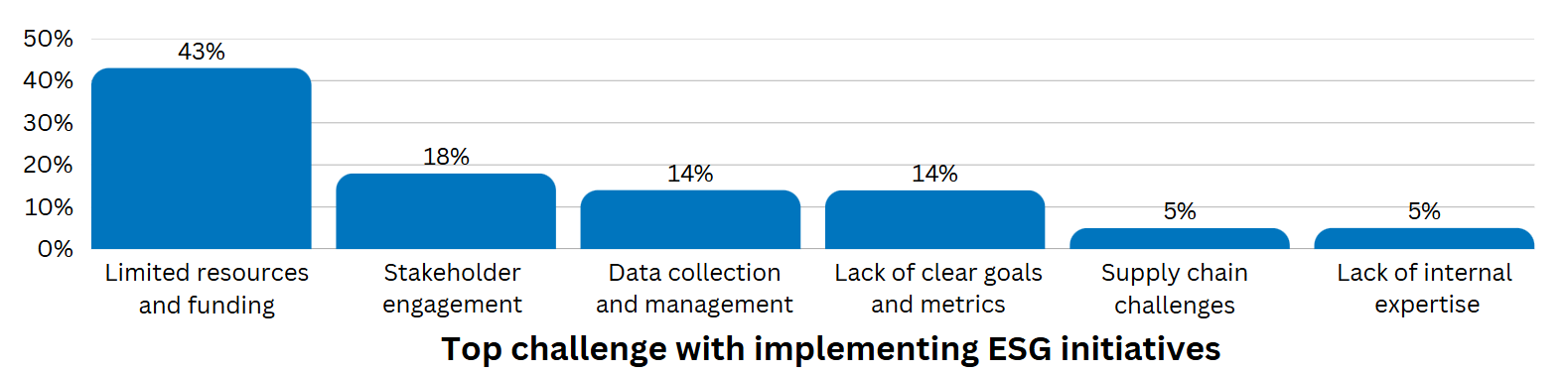 The primary challenge hindering the implementation of ESG initiatives at healthcare institutions today is limited resources and funding, cited by 43% of imagePRO panel members. Beyond this significant obstacle, stakeholder engagement, data collection and management, and a lack of clear goals and metrics are also key challenges, reported by 18%, 14%, and 14% respectively.