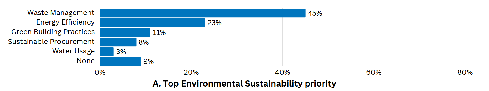 Waste management (45%) and energy efficiency (23%) are the current top two environmental priorities in US healthcare institutions according to the imagePRO panel members. 11% prioritize green building practices, 8% focus on sustainable procurement, and 3% on water usage. 9% of the institutions have no environmental sustainability priority.