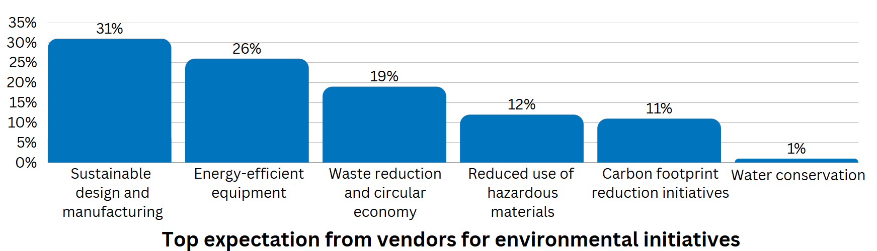 When it comes to MedTech vendors, their ESG initiatives currently have little influence on purchasing decisions, but this is expected to increase (see results in “Importance of ESG Initiatives”). Nevertheless, the top expectations of healthcare providers and institutions from vendors are to offer sustainable design and manufacturing of equipment (31% of imagePRO panel members), to develop energy-efficient equipment (26%), to reduce waste and improve circular economy (19%), to reduce the use of hazardous materials (12%), and to develop carbon footprint reduction initiatives. Only 1% of imagePRO panel members expect vendors to focus on water conservation as their top environmental priority.