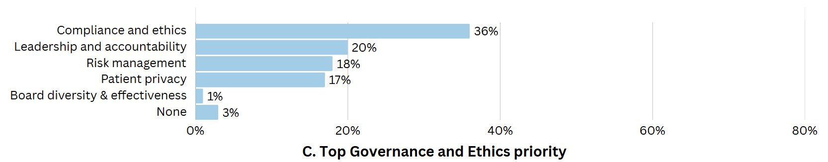 Compliance and ethics are the top governance priority for 36% of US healthcare institutions. Other important governance initiatives include leadership and accountability for 20%, risk management for 18%, and patient privacy for 17%.