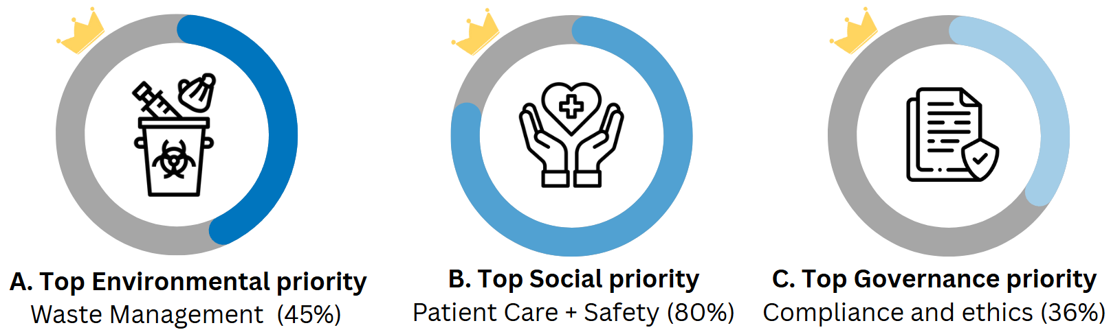 These expectations from vendors are aligned with healthcare institutions’ top environmental priorities, with waste management (45%) and energy efficiency (23%) currently ranking as their top two (see “Top ESG priorities”).