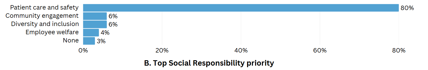 Patient care and safety are the top social priority for 80% of healthcare institutions. While this result is unsurprising and reinforces the core mission of these organizations to serve patients, the focus on other social priorities is considerably lower. Six percent of US healthcare institutions prioritize community engagement or diversity and inclusion. Notably, only 4% emphasize employee welfare as a primary social initiative. This is somewhat unexpected and arguably should be higher, given that staff shortages and turnover remain critical issues in healthcare. Prioritizing employee welfare could significantly improve staff retention and loyalty