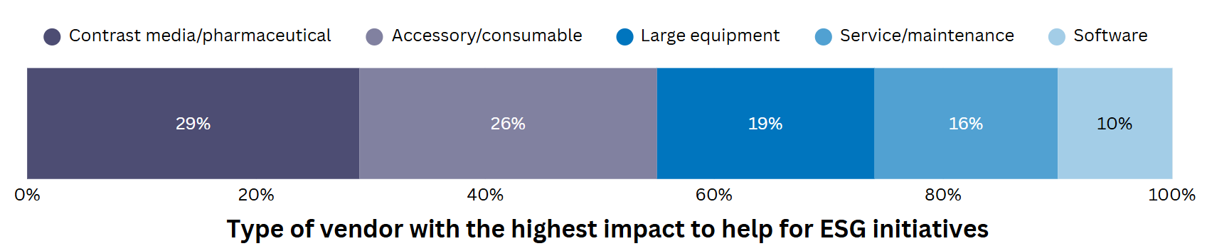 In the radiology department, contrast media and pharmaceutical companies are perceived as having the greatest potential to contribute to ESG initiatives, according to 29% of imagePRO panel members. Suppliers of radiology accessories and consumables follow closely at 26%, while large equipment OEMs are ranked third (19%).