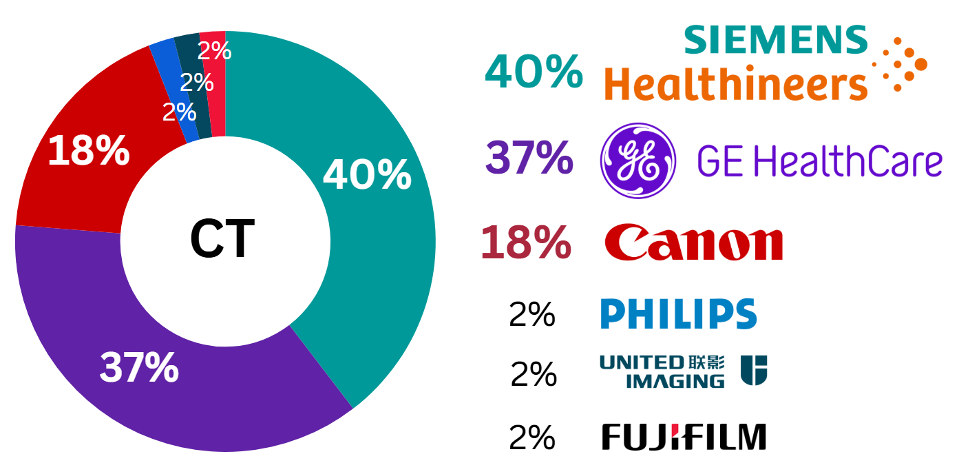 For CT, Siemens Healthineers (40%) and GE Healthcare (37%) are the 2 vendors most selected as offering the best CT products. Canon is third with 18% and other vendors are behind with 2% (Philips, United Imaging, and FujiFilm).