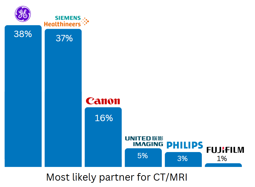 For the most likely partner for 2025, it is no surprise to find the top 3 vendors of MR and CT all together. GE Healthcare and Siemens Healthineers are most likely to be selected as vendor for CT and MR equipment in 2025 with 38% and 37% respectively. Canon is selected by 16 as most likely partner for large medical imaging equipment for 2025. The three other players (United Imaging, Philips, FujiFilm) are within the margin of error with less than 5%.