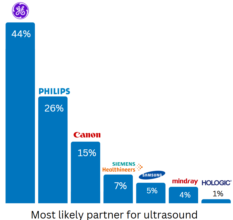 In ultrasound, the “most likely partner for 2025” order exactly reflects the “best vendor for ultrasound equipment” but with a larger difference between GE Healthcare and Philips (44% and 26% respectively, compared to 40% and 32% for best vendor), which may indicate a better commercial performance of GE Healthcare on the US territory.