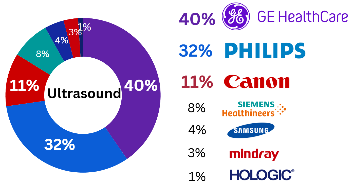 For Ultrasound, the company commercializing the best ultrasound systems is GE Healthcare, selected by 40% of imagePRO members. Philips is second (32%) and Canon third (11%). Siemens Healthineers is selected by 7%, Samsung by 5%, Mindray by 4%, and Hologic by 1%.