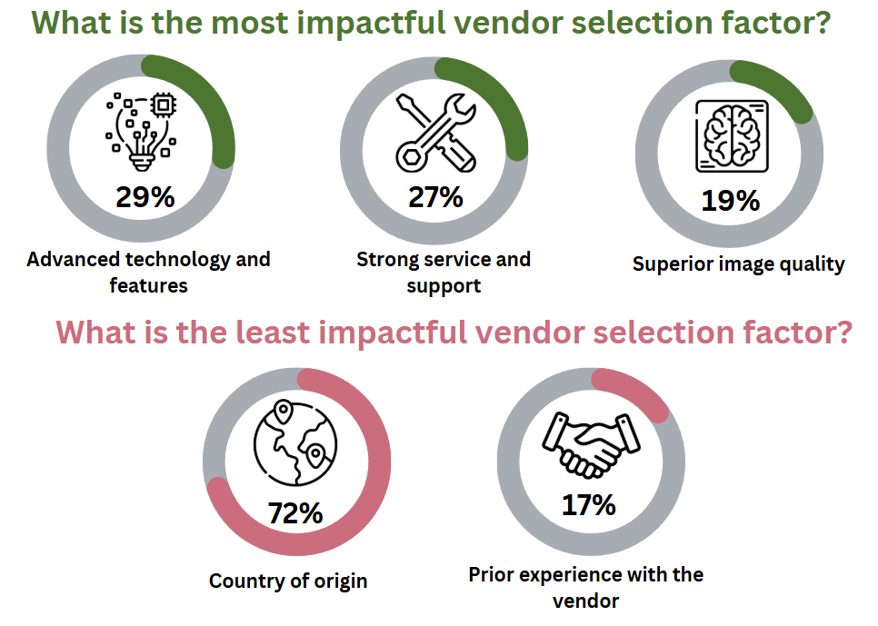 The country of origin is considered the least impactful factor for MRI vendor selection by 72%.