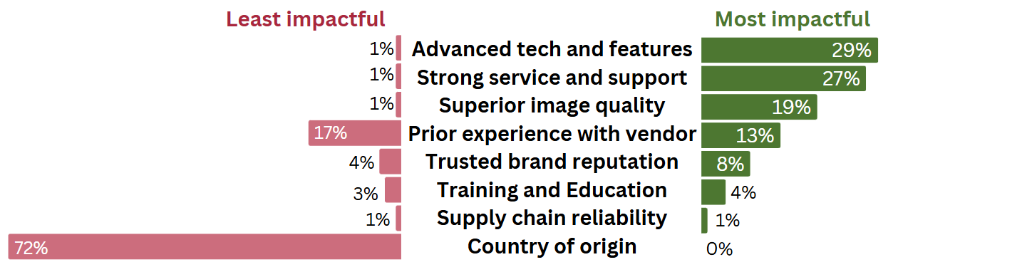 Aside from price, advanced technologies and features (29%), strong service and support (27%), and superior image quality (19%) are the most impactful factors when selecting an MRI vendor. One vendor must strongly address these elements to be selected for next MRI purchase.