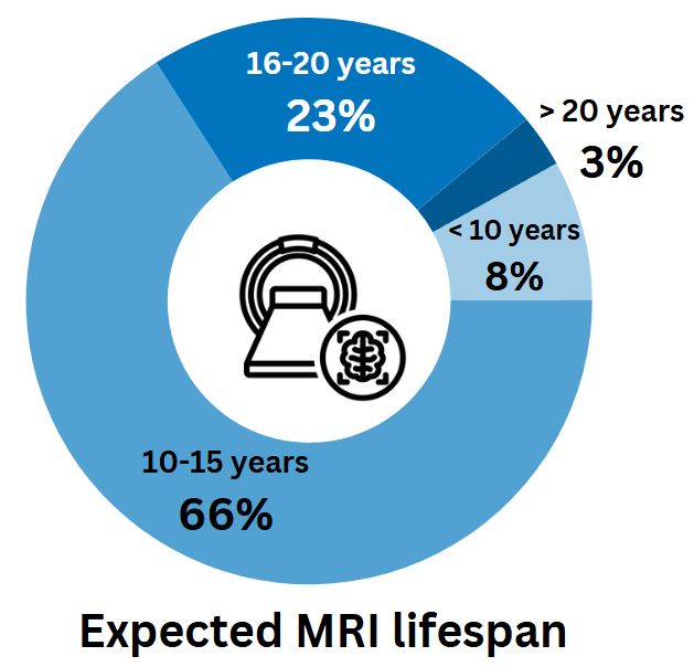 However, the trend is shifting toward extending the lifespan of MRI scanners. Only 8% expect their MRI system to last less than 10 years, while 23% foresee it lasting 16 to 20 years, and 3% predict a lifespan of over 20 years. Service, maintenance, and upgrade offerings will be crucial for MRI scanners to handle increased usage over extended periods.