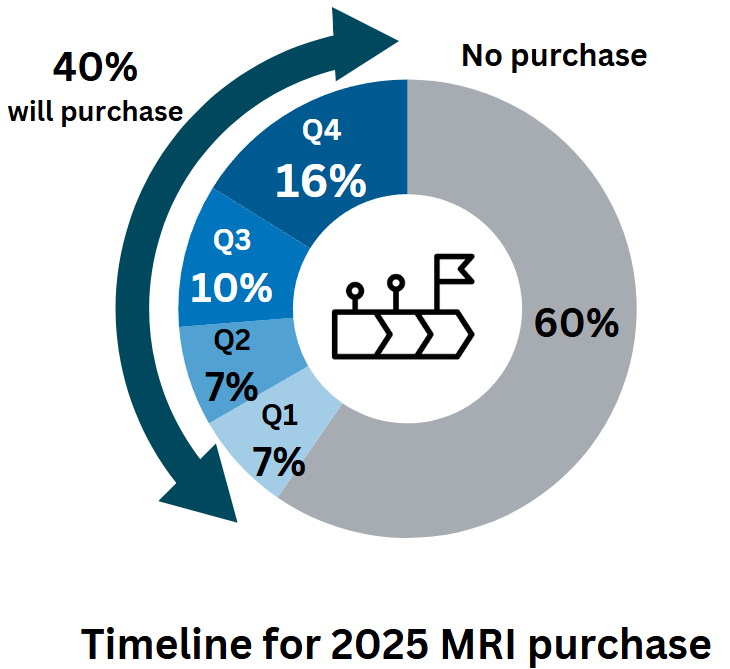 40% of the imagePRO panel members expect to purchase an MRI in 2025. The majority of new MRI purchases will happen in the second half of 2025, with 16% of imagePRO members expecting to make their product selection in Q4 and 10% in Q3. Meanwhile, 14% of imagePRO members will finalize their MRI deals in early 2025 (7% in Q1 and 7% in Q2).