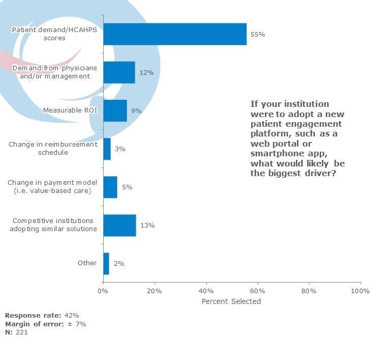 - Finally, patient demand/HCAHPS scores are the largest drivers for adopting new patient engagement platforms.