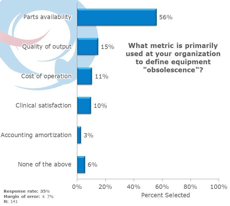 The primary metric used by organizations to define equipment obsolescence is parts availability, with 56% of respondents selecting this option. Other metrics used include quality of output (15%), cost of operation (11%), clinical satisfaction (10%), accounting amortization (3%), and none of the above (6%). This suggests that most organizations prioritize the availability of replacement parts when determining whether equipment is obsolete, although other factors are also considered to a lesser extent.