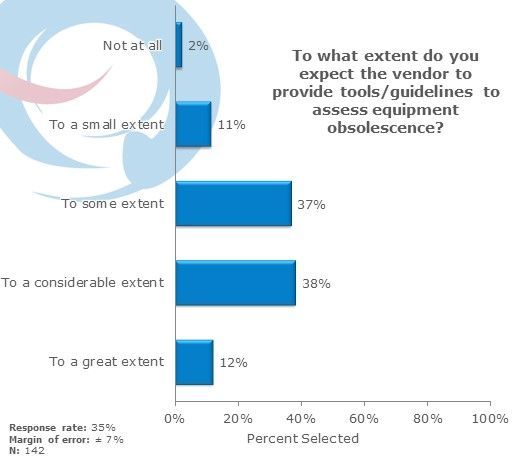The majority, 75%, believe vendors should be involved "to a considerable extent" (38%) or "to some extent" (37%). A smaller portion, 12%, expects significant vendor involvement "to a great extent." Only 11% think vendors should contribute "to a small extent," and a minimal 2% feel there is no need for vendor involvement at all. This data suggests that most respondents see a role for vendors in helping to evaluate equipment obsolescence, but they also feel that the vendor's role should be somewhat limited.