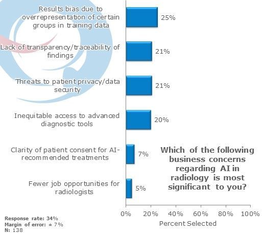 Concerns about "lack of transparency," "threats to patient privacy," and "inequitable access" are among the primary concerns cited by 20% regarding AI in radiology. These concerns highlight the potential ethical and practical challenges that AI integration may pose in the medical field. Conversely, only 7% of our panelists reported that "fewer job opportunities for radiologists" was a significant concern, suggesting that job security is currently perceived as a lesser issue compared to the broader ethical and access-related implications of AI technology.