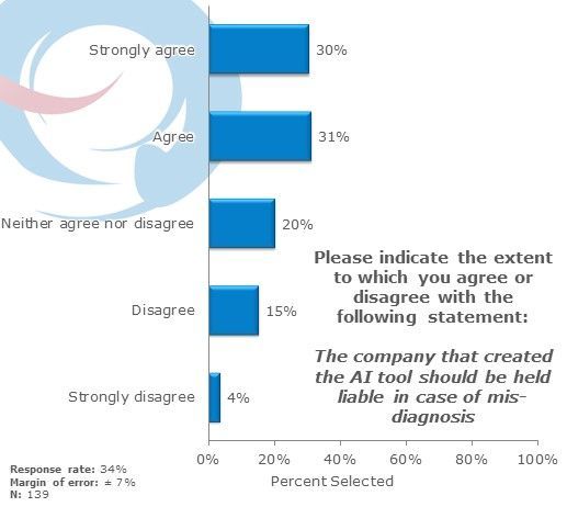A notable 61% of our panelists agree or strongly agree that AI tool manufacturers should be held accountable in the event of a misdiagnosis.