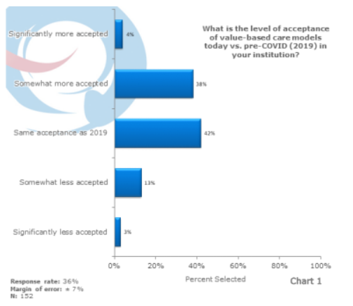 42% of panelists consider that value-based healthcare is at least somewhat more accepted compared to pre-COVID period. Additionally, the same proportion of respondents (42%) believe that COVID-19 had no change in their acceptance level. Comparatively, only 16% reported a decrease in acceptance (chart 1).