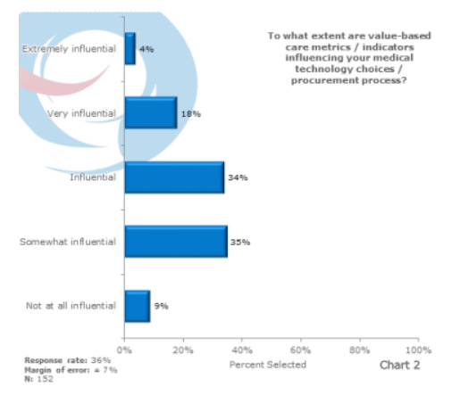 The perceived increased acceptance level has a direct impact in most respondent's medical technology procurement process. Most (56%) reported that their MedTech selection and buying processes are influenced by value-based care metrics. In comparison, only 9% of our respondents consider that value-based metrics have no influence at all during their internal purchasing process (chart 2).