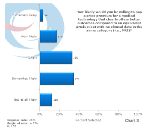 While budgets are generally predefined, 87% of our respondents stated that they are at least somewhat likely to pay a premium if a medical technology product has proven clinical data of better patient outcomes. On the other hand, 13% reported that they are not likely to pay more, even if a product has superior clinical outcomes (chart 3).