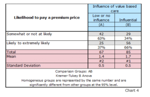 In addition, there is a direct statistical correlation between the influence of value-based care metrics and the likelihood to pay a premium price. In fact, out of all the respondents who reported being influenced by value-based metrics, 66% said that they are likely to extremely likely to pay a premium price (chart 4).